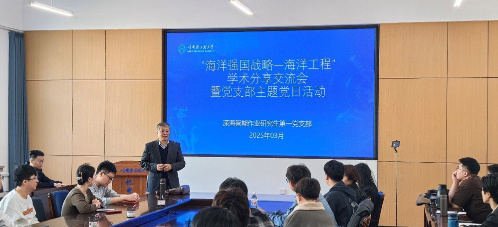 为进一步加强研究生党支部建设,推进党建业务深度融合。2025年3月23日,机电工程学院深海智能作业研究生第一党支部开展“海洋强国战略—海洋工程学术分享交流会”主题党日活动。本次交流会邀请了学院退休党员王立权老师和博士生党员陶浩涵同学进行经验分享,旨在通过教授传达老一辈科研精神以及优秀党员的科研经验交流,激发党支部成员的科研热情,促进学术交流与合作。团队青年教师、研究生辅导员运飞宏副教授参加活动。