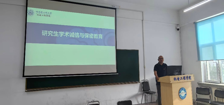 李立全书记作学术诚信与保密教育专题讲座,结合《高等学校科学技术学术规范指南》和《哈尔滨工程大学科研诚信建设与学术不端行为处理办法》,通过典型案例深入剖析学术不端的危害,强调学术诚信是优良学风与健康学术生态的根本保障;在保密教育环节,他阐述了保密工作的重要意义,提醒同学们在日常学习与科研中切实增强保密意识与防范能力,共同守护国家安全与利益。
