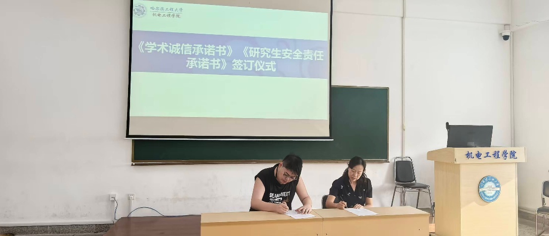 会上,2025级研究生代表与导师代表签订了《哈尔滨工程大学研究生学术诚信承诺书》和《机电工程学院研究生安全责任承诺书》。