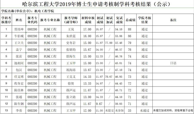 机电工程学院2019年(2018年秋季学期)博士生申请考核制招生学科考核结果公示如下,若有疑义请联系哈尔滨工程大学机电工程学院教务办公室045182569710反映。