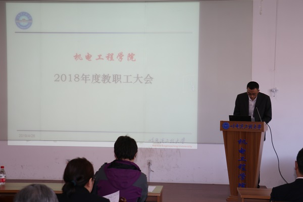 2018年4月26日上午10时,机电学院在61号楼3096室隆重召开2018年度教职工代表大会。大会由学院副书记牟道富同志主持,校工会常务副主席赵镇出席本次会议,机电学院全体教职工参会。