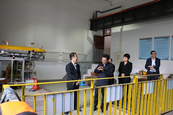 高书记一行两人实地考察了机械创新实验室、机械综合实验室、机械典型分析实验室等教学实验室以及舰船特辅与水下装备重点实验室、水池、水下作业机器人实验室等科研实验室。