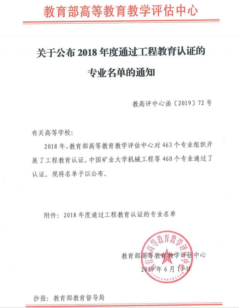 6月13日,教育部高等教育教学评估中心公布了2018年工程教育认证结果,机电工程学院机械设计制造及其自动化专业正式通过工程教育认证,并获得六年最长有效期。通过认证专业的毕业生在《华盛顿协议》相关国家和地区申请工程师执业资格或申请研究生学位时,将享有当地毕业生同等待遇。进行专业认证就是要和国际进行接轨,提高教育质量。