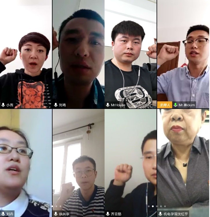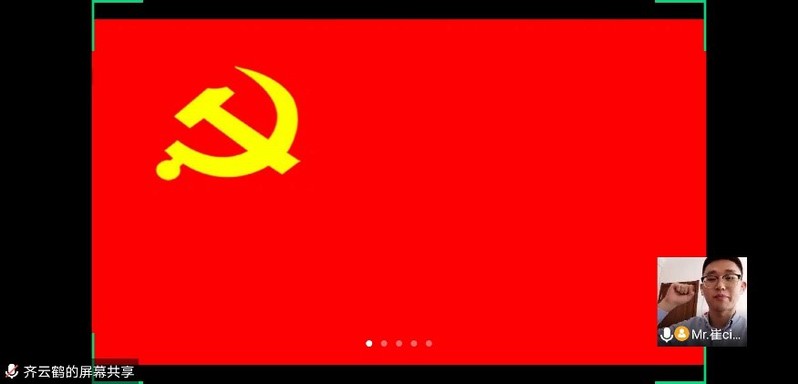最后在鲜艳的党旗下,支部全体党员在领誓人崔健的带领下重温了入党誓词,将共产党人的初心与使命牢牢地印在心中,进一步强化支部战斗堡垒作用,落实学院发展战略,以必胜的姿态坚决打赢疫情防控及在线教学战。随着党日活动的临近尾声,各位党员同志纷纷在群中表达了对此次战疫的信心和决心,相信此次党日活动让支部成为人才培养一线上最坚不可摧的战斗堡垒。