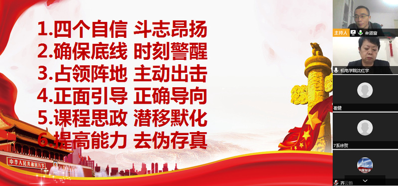 为切实抓好疫情防控期间的意识形态工作,机电学院党委于4月20日下午召开意识形态工作培训及工作布置线上会议,参会人员包括学院党委委员、各教工党支部书记、全体研究生导师、班主任、学工办全体人员,会议由党委书记沈红宇主持。