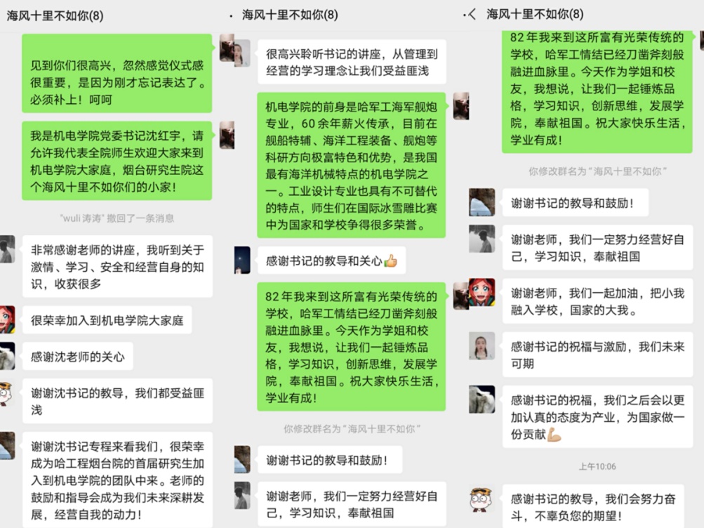 沈红宇指出,学院教师作为基地和纽带,要加强与企业之间的沟通和联系,寻找人才培养新模式、新方法,积极参与烟台研究院的建设中。沈红宇向新生们介绍了哈军工传统文化、学校学院相关政策、工业设计专业背景知识,并对新生提出了保持激情、认真学习、注意安全三点要求。沈红宇结合身边事例教育学生们一定要学会经营自己,切忌不是钻营,真诚待人,抓住发展机会,积累成长机遇。讲座结束后,学生纷纷表示感谢沈书记的教导和鼓励,他们一定努力学习报效祖国。