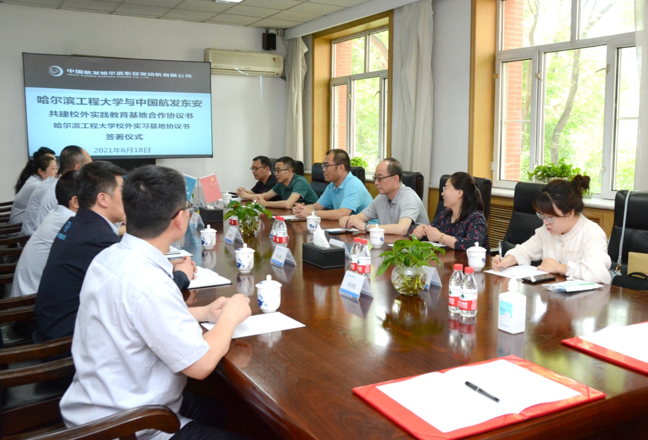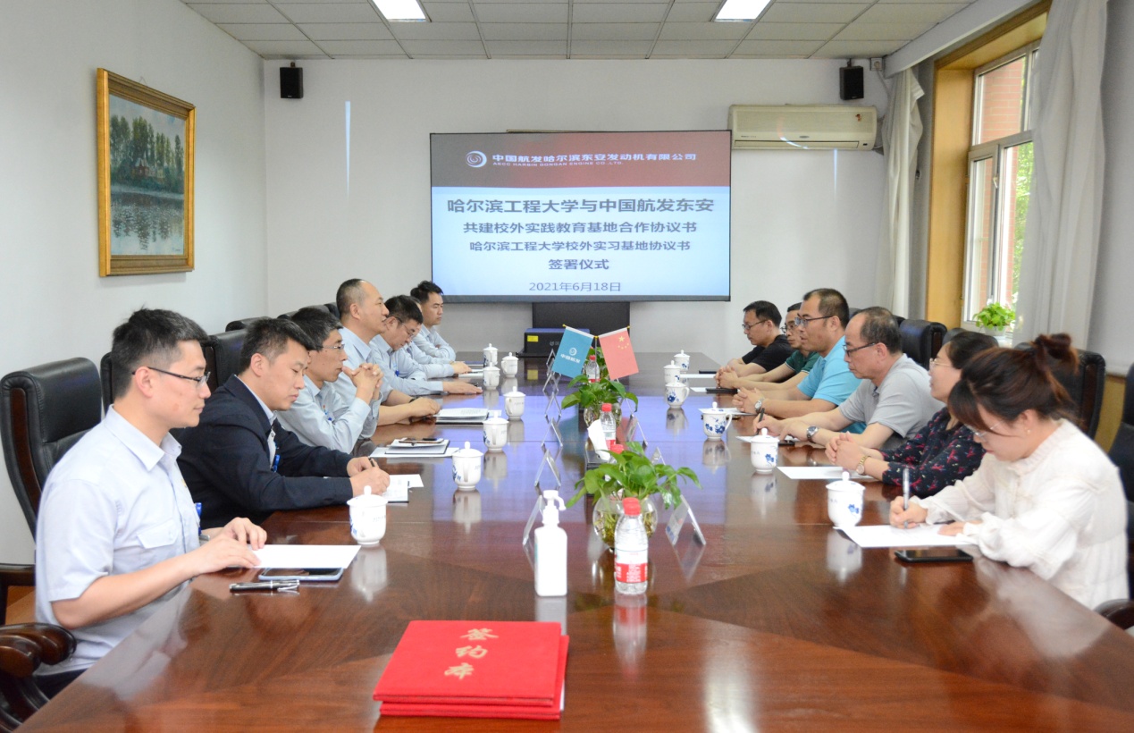 中国航发东安党委副书记、工会主席鲍兴财与机电学院党委书记吕春雷作为代表签署了《哈尔滨工程大学与中国航发哈尔滨东安发动机有限公司共建校外实践教育基地合作协议书》、《哈尔滨工程大学校外实习基地协议书》。