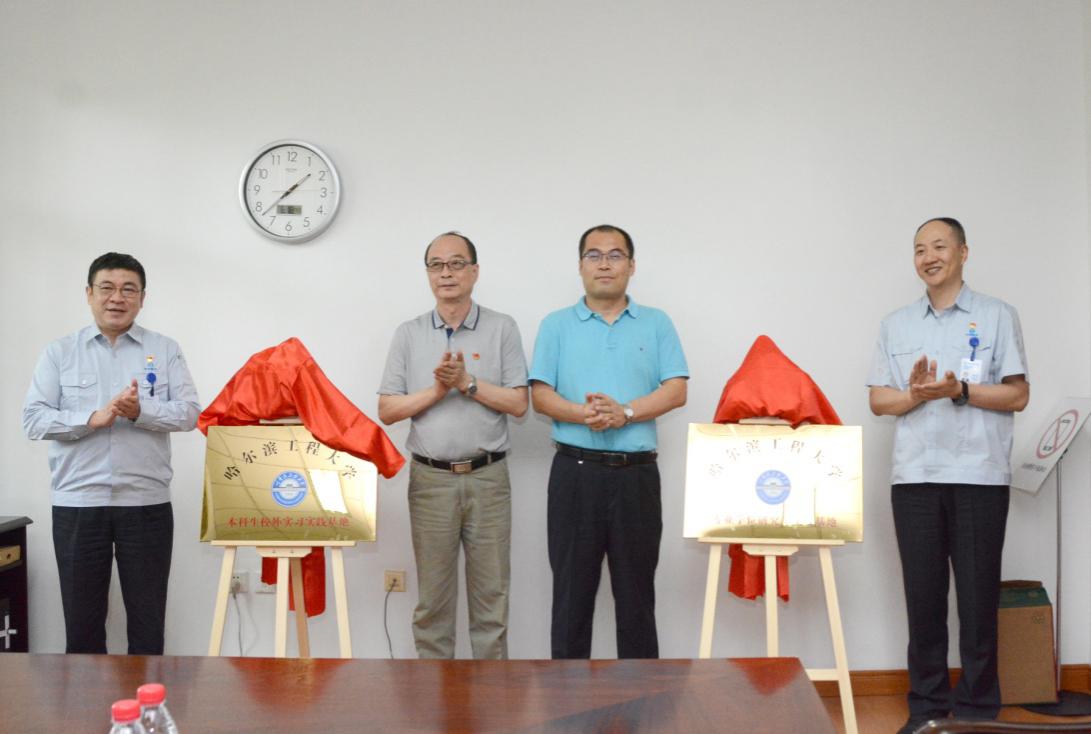 机电学院院长徐建安、党委书记吕春雷与中国航发东安党委副书记、工会主席鲍兴财、人力资源部部长姜佳忠共同为实习基地揭牌。