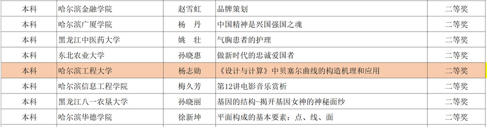 在刚刚结束的第九届黑龙江省青年教师多媒体课件制作比赛中,经各高校推荐和专家组评选,共评选获奖作品72件,机电工程学院杨志勋副教授的作品“《设计与计算》—贝塞尔曲线的构造机理和应用”荣获本科院校组二等奖。