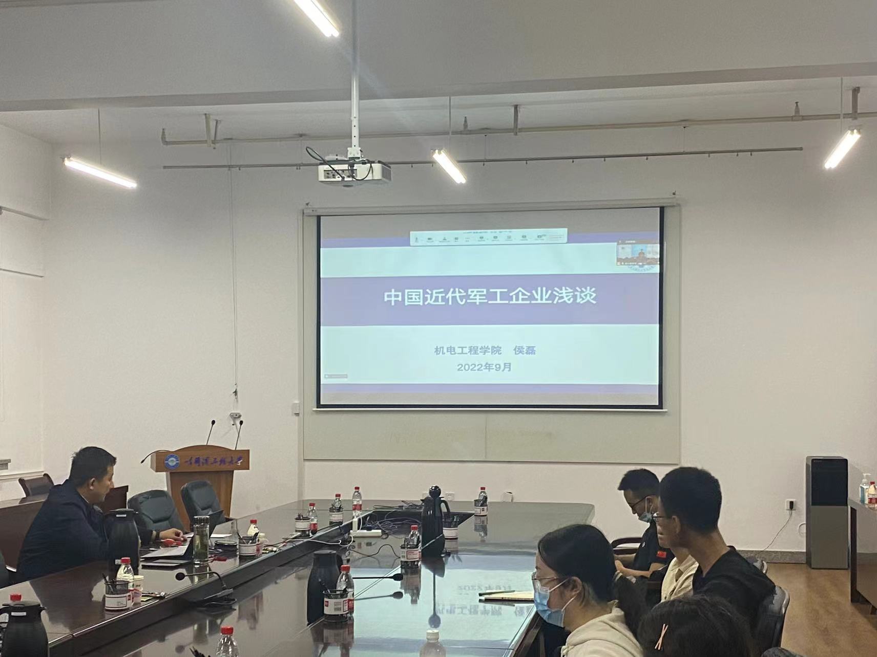 2022年9月4日晚,学院于61号楼3045办公室召开就业指导军工企业专场宣讲会议。党委副书记侯磊同志面向机电学院全体硕士、博士讲解(PPT)中国军工企业历史变迁、军工高校、军工集团以及军工大院大所大厂等内容。会议采用线上线下相结合的方式召开,学生代表线下参会,全体硕士研究生、博士研究生在腾讯会议平台线上参会。