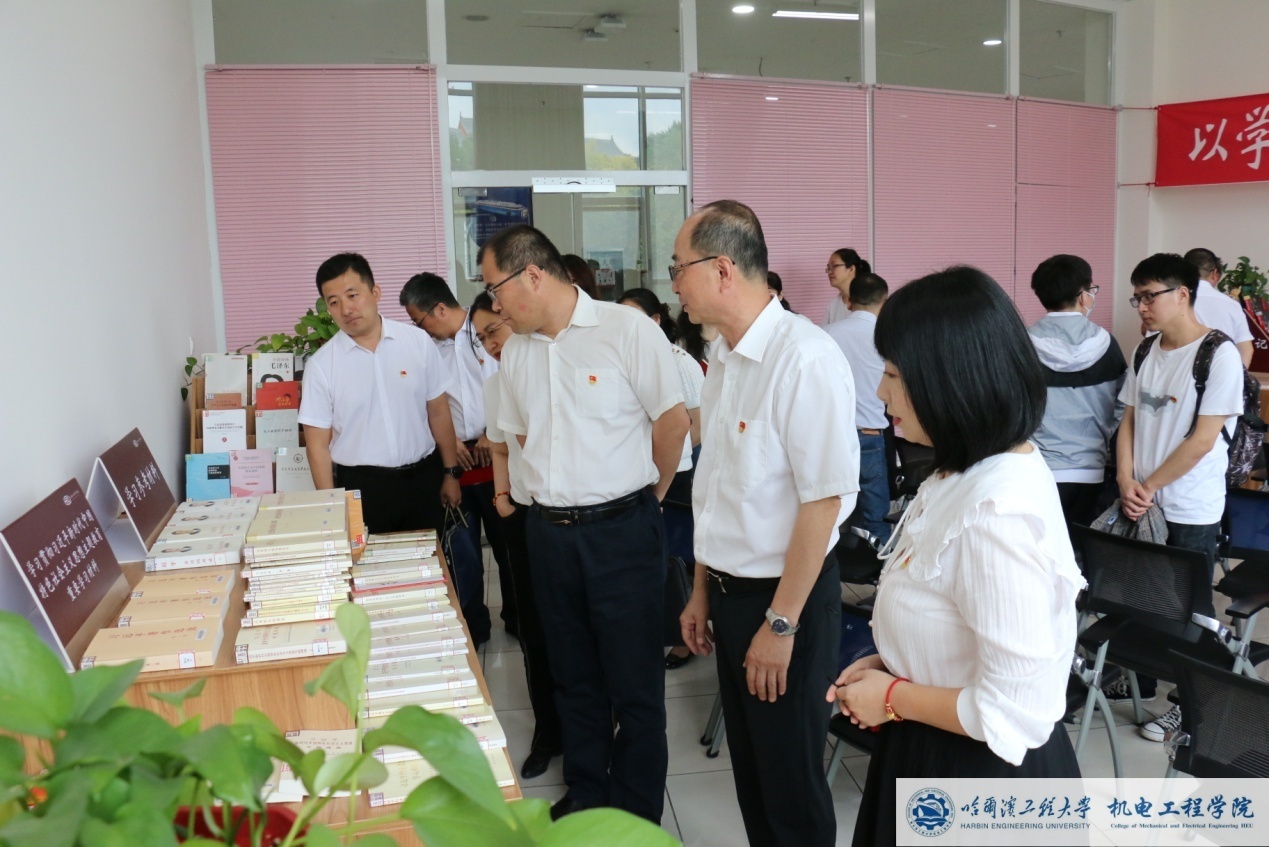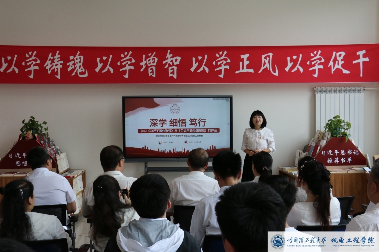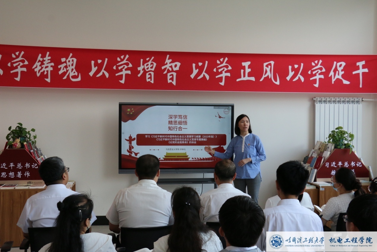 6月12日上午,机电工程学院党委在图书馆主题教育教室召开了学习贯彻习近平新时代中国特色社会主义思想主题教育读书班活动,邀请马克思主义学院许钟元、金璐璐进行主题教育辅导书目导读。学院班子成员、党委委员、教工党支部书记、学生党支部书记代表、机关办公室主任、辅导员参加,活动由学院党委副书记侯磊主持。许钟元以《深学笃信、精思细悟、知行合一》为题介绍了《习近平新时代中国特色社会主义思想学习纲要(2023年版)、《习近平新时代中国特色社会主义思想专题摘编》、《论党的自我革命》学习体会,从总体情况、相关文本的对比分析、4个“新”内容对3本主题教育必读书目进行了详细解读。金璐璐以《深思、细悟、笃行》为题对《习近平著作选读》、《习近平谈治国理政》进行了导读,从《习近平著作选读》与《习近平谈治国理政》的同与不同、《习近平著作选读》中的新增加、新扩展、新凝练方面进行了对比。通过两位老师的导学,使得学院读书班对主题教育书目有了更深一步的感悟和理解,进一步提升主题教育理论学习的质量和水平。学院党委书记吕春雷强调,学院党委理论学习中心组成员要带头原原本本读原著学原文悟原理,利用集中学习和自学时间,持续反复通读精读所要求学习书目。会后,参会人员对主题教育相关书籍进行了参观与学习。