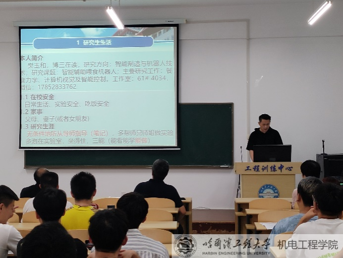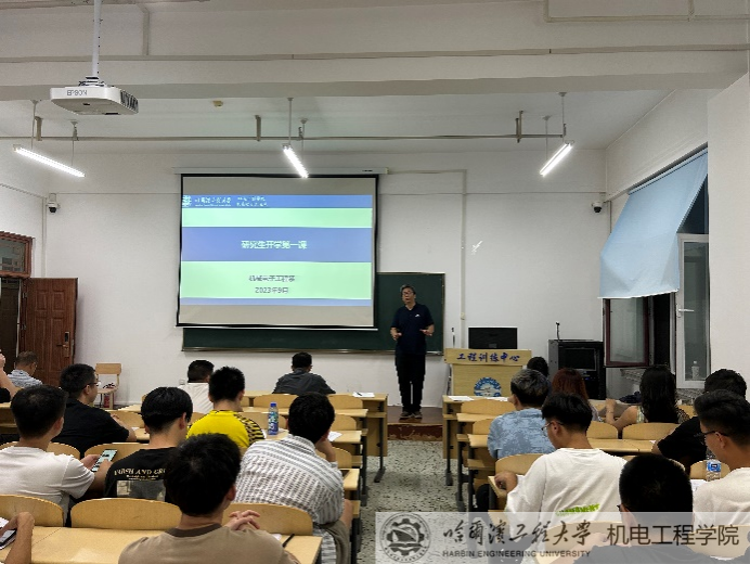 机械电子工程系主任王克义副教授,为2023级研究生讲了入学第一课,详细介绍了学校、学院及机械电子系学科发展历程、学科特色、科研方向、师资队伍、人才培养目标、课程建设和教学科研成果,提升2023级学生对学校、学院、学科、专业的认知度和认同感,鼓励同学们以优秀学生为榜样,要志存高远、脚踏实地、行循自然,学好知识,打好基础,增长才干,将来为中华民族伟大复兴贡献自己的智慧和力量。