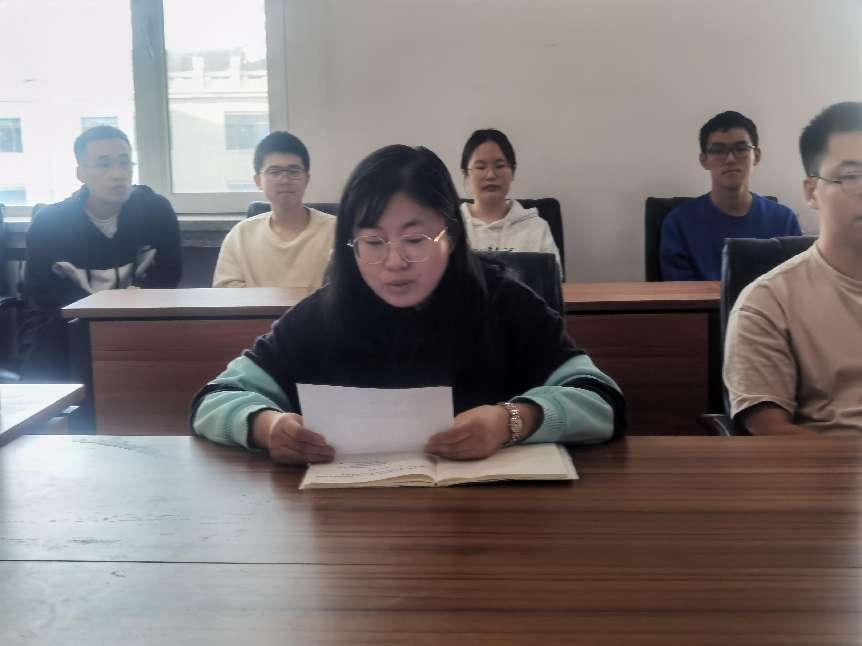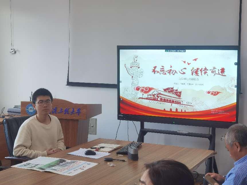 本科生第四党支部书记李明昊结合学生工作相关经历,宣讲习近平总书记视察哈尔滨工程大学重要讲话精神。他讲述了在学生工作中,不同岗位上各位党员老师和同学的出色表现和优秀品质,并强调:作为哈军工传人,我们要牢记习总书记嘱托,努力学习,刻苦钻研,不忘初心,砥砺前行,展现青春力量,绽放美丽花朵。