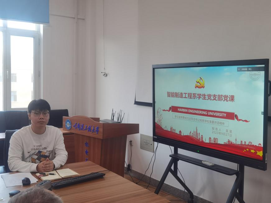 智能制造工程系学生党支部书记吴昊结合自身学习科研工作,宣讲习近平总书记视察哈尔滨工程大学重要讲话精神。他结合自身工作经历,为同学们讲述了习近平总书记视察哈尔滨工程大学重要讲话精神在学习生活中的重要体现。他激励同学们:我们应该更加珍视哈军工荣誉,传承哈军工传统,继续聚焦科技前沿和国家重大需求,到祖国需要的地方去,为建设海洋强国奉献青春和力量。