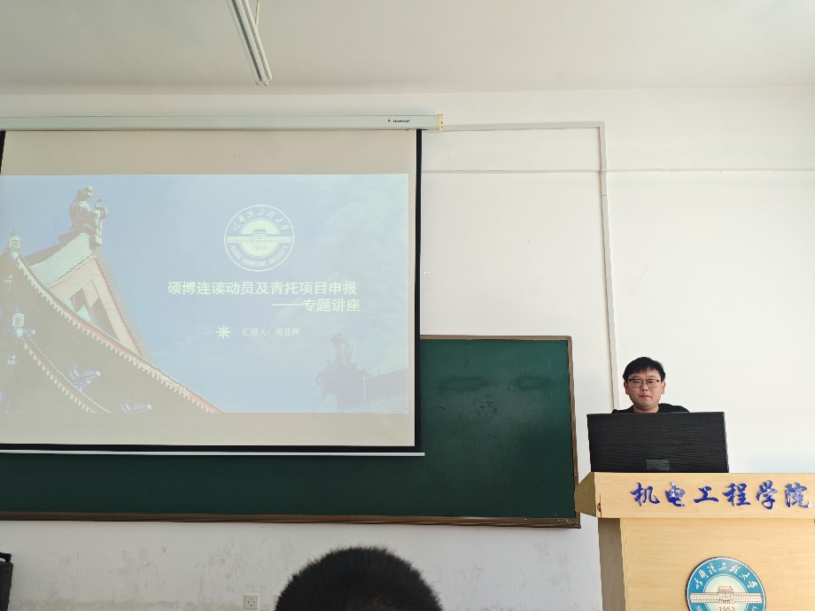为落实机电工程学院研究生导师发展分中心工作部署,强化研究生学术交流,进一步提升人才培养质量,2025年11月21日,学院青培专项计划解读与硕博连读动员会议在61号楼4112会议室召开。会议由辅导员刘鸣主持,2021级博士研究生周亚辉作专题分享,八十余名硕博学生代表参会。
